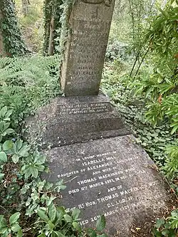 McKinnon Wood married Isabella Sandison, daughter of Alexander Sandison, in 1883.[1] They had eight children, six sons and two daughters. Two sons and one daughter predeceased him.[1] McKinnon Wood died in South Kensington two weeks after his wife in March 1927, aged 72.[1][2][3] Following a funeral service at Whitefield's Tabernacle, Tottenham Court Road, McKinnon Wood was buried in a family vault on the eastern side of Highgate Cemetery[3] (plot no.31039), opposite the grave of George Eliot. He left an estate valued at £130,372.[2]
