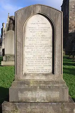 He died at Humbie in East Lothian on 6 October 1923 but is buried with his parents in Corstorphine Parish Churchyard in western Edinburgh.[4]