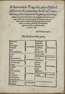 The play illustrates the transition from the morality play to historical drama. The dramatis personae include allegorical figures (e.g. Cruelty, Small Ability)[7] as well as historical personages (such as the title character, Cambyses II of Persia). The plot, characterisation, and language are rugged and uncouth. Murder and bloodshed abound. The play is largely written in rhyming fourteener couplets, with some irregular heroic verse (as in the speeches of the comic character Ambidexter). The bombastic grandiloquence of the piece became proverbial, and Shakespeare is believed to allude to it when he makes Falstaff say "I must speak in passion, and I will do it in King Cambyses' vein" (Henry IV, Part 1, ii.4).