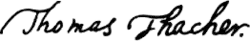 Thomas Thacher was born in Milton Clevedon on 1 May 1620.[1] He we was educated by his father, a minister at Salisbury, who prepared him for entrance to one of the English universities, but the son declined to subscribe to the religious tests that were then a condition of matriculation, and resolved on settling in New England. He reached Boston on 4 June 1635, and soon afterward entered the family of Reverend Charles Chauncy at Scituate, under whose guidance he studied mental philosophy and theology, and attained a remarkable knowledge of the Eastern languages. He was especially noted for the great beauty of his transcriptions of Syriac and other Eastern characters, and also acquired a knowledge of medicine, practicing occasionally with success.