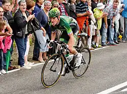 In January, Voeckler was set to participate to the Tour Down Under, but he crashed into a car while training in Australia and broke his collarbone.[23] He came back to competition at the Tour Méditerranéen, then went on to finish 25th in the Amstel Gold Race and 36th in Liège–Bastogne–Liège. He then participated to the Tour de Romandie in April, attacking to no avail in the final of the first stage.[24] On the fourth stage, he took second place after being beaten for the sprint by his breakaway companion Michael Albasini (Orica–GreenEDGE).[25] Voeckler finished 21st overall. Voeckler had a significant result in the Tour de France, finishing second on the stage to Bagnères-de-Luchon behind Michael Rogers.[26] In August, while he was training, Voeckler hit a car and was injured again, this time dislocating his shoulder.[27] He came back at the Tour du Doubs, finishing 46th. In October, Voeckler finished second of Paris–Tours, after being part of the early breakaway. He cooperated well with his breakaway companion Jelle Wallays until the "last kilometer to go" sign, where Wallays refused to pull and Voeckler was beaten in the two-man sprint. He was so disappointed that he did not go to the podium ceremony, which resulted in a fine and the loss of the €3,770 second-place prize.[28]