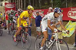 In the ninth stage of the Tour de France, Voeckler led a breakaway, survived a collision caused by a media support car that injured two other riders,[9] and crossed the line second, taking the overall time lead and therefore wearing the yellow jersey (French: maillot jaune). He held on to the yellow jersey daily from the beginning of Stage 10 onwards, carrying it through all the Pyrenean mountain stages and into the Alps, but he was unable to retain it at the end of Stage 19, the queen stage finishing at Alpe d'Huez. Voeckler finished in fourth place in the final general classification, 3 minutes and 20 seconds behind the winner, Cadel Evans. It was Voeckler's highest final general classification in the Tour, and the highest placing of any Frenchman in the Tour, at the time, since Christophe Moreau's fourth-place overall finish in 2000.[10]