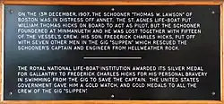 In 2008 a memorial seat was blessed by the Reverend Guy Scott in the churchyard of St Agnes, the nearest inhabitable island to the wreck and the home of the pilot, Billy "Cook" Hicks. The seat, made of granite from a St Breward quarry, faces the mass, unmarked grave of many of Thomas W. Lawson's dead.[3]