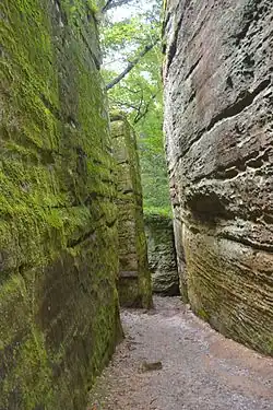 The Thompson Brothers Rock Art is an inscribed rock located within Giant City State Park in Union County, Illinois. Four names are carved into the rock, all but possibly one of which were inscribed by Union soldiers or supporters during the Civil War. The two most prominent signatures belong to brothers Albert S. and T. W. Thompson; the former was a Union soldier, while the latter served as Deputy Provost Marshal and was responsible for locating Union deserters. Union soldier Thomas L. Bailey also carved his name into the rock; the fourth name, A. Parker, may have been either a fellow soldier or a resident of the area who added his name after the war. The rock was carved at a time when Union supporters and Southern sympathizers fought for control of southern Illinois, and as the Thompson family were among the most prominent Union supporters, it represents an attempt to physically claim the area for the North. The Confederate sympathizers' inability to deface the names signifies their gradual loss of power in the area. The rock is now one of the few surviving Civil War sites in Illinois.[2]