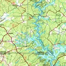 Thompson Creek rises in eastern Dawson County, just west of U.S. Route 19/State Route 400 and just north of State Route 53, and southeast of Dawsonville.[2] The creek heads southeast for less than a half a mile, then crosses US 19/SR 400 and heads south along the highway, before turning east and forming the Thompson Creek arm of Lake Lanier, which is the westernmost arm of the lake, just east of SR 400. This arm also receives one additional unnamed branch coming from the south, before Thompson Creek meets the Chestatee River, which is submerged under Lake Lanier at the point of their confluence at the intersection of the Chestatee and Thompson Lake Lanier arms.[3]