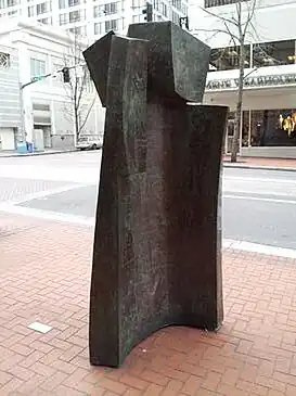 Thor is an abstract outdoor sculpture depicting Thor, the hammer-wielding god of thunder in Norse mythology. Located at the intersection of Southwest 6th Avenue and Southwest Taylor Street in the Portland Transit Mall, the copper on redwood sculpture was completed in 1977, funded by TriMet and the United States Department of Transportation. It measures 7 feet (2.1 m) x 4 feet (1.2 m) x 4 feet (1.2 m).[1] According to the Regional Arts & Culture Council, the agency which administers Thor, "This piece served as a excellent example of Schuler's work, which is characterized by large cubic and angular sculptures achieved by hammering copper onto carved redwood. This process creates a unique and recognizable finish to his sculptures."[1] The sculpture was previously located at Southwest 5th between Washington and Alder.[2]