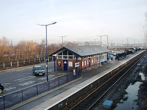 After being taken over by British Railways on nationalisation, the decayed station was never really repaired post war, but kept its proud staff and hence well kept flower borders.[3] The variety of stone carvings also gained the station an entry in the newly created Guinness Book of Rail Facts and Feats.[3] With dwindling passenger numbers, staff were removed in the early 1970s, which led to a dramatic level of vandalism to the decayed station structures. After promises to refurbish the station due to local protests from 1977, the station buildings were demolished in December 1981 in what was described locally as "institutionalised vandalism".[3] In both 1988 and 1994, BR proposed renaming the resulting "bus shelter" station as Stockton, but this and a later proposal in 2000 by Northern Spirit to rename the station as South Stockton were stopped by local protests.[3]
