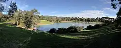 The reserve has picnic areas, barbecues, play equipment for children, large grassy areas, wheelchair-friendly walking paths, an amphitheatre, waterways and a terraced series of ponds and wetlands which support diverse native flora and fauna.[4] In 2014, the prospect of establishing a community orchard within the Thorndon Park Reserve was considered.[5] Dogs are not permitted in the park.[6]