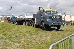 At this time, the intention was that the even heavier Conqueror tank would be transported by a whole new transporter of equally large capacity, the Leyland FV 1000.[4] This was 2 feet (61 cm) wider than the Antar, as the Antar had in turn been 2 feet (61 cm) wider than the Diamond T. They were to be equipped with a semi-trailer of 60 tons capacity, given the design number FV 3301. This design was ungainly and top-heavy when loaded, being high at the rear to clear the wheels and sloping downwards towards the front to better place the weight of the load.