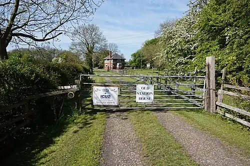 ![]() Looking along the dismantled line towards the former station house and the site of the station (2019) | |||||