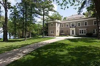 The Mary North house is a separate mansion, closer to the lake - a more formal design with a symmetric facade, a heavy cornice and entablature, two tall chimneys and a cupola with a red tile roof. Its front door is flanked by classical columns.[5]: 6