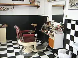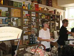 All the items are displayed in 18 small shops, typical of the 1920s. In addition to the grocer's which forms the entrance, there is an old bank, a locksmith, a lingerie store, a tobacco shop, a tailor's, an ice cream parlor, a butcher's, a photographer's and a post office.[6] There is an old cigarette machine which used to deliver 10 cigarettes for 40 øre, a radio store with the second TV set ever to come to Møn and a barber's where, if you come on the right day, you can get a shave.[2] The old classroom consists of eight small wooden desks from Vordingborg but these are soon to be replaced by desks from Møn's Sprove Skole.[7]
