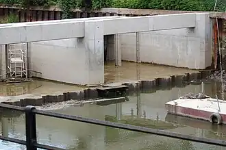 The weir has been constructed across the Three Mills Wall River (also known as Shortwall) by British Waterways.[8] In conjunction with Three Mills Lock and sluice, the two structures stabilise levels at 7.5 feet (2.3 m) above ordnance datum (AOD) around the Queen Elizabeth Olympic Park, whereas they used to rise to 15.8 feet (4.8 m) AOD previously.[6] The structures came into operation in 2009.[9][10] Because the upstream water level remains fairly constant throughout the period when eels and elvers migrate, one of the flaps of the weir was fiited with a simple overflow eel pass. This reduced the flood capacity of that flap, but was not thought to increase the flood risk. The installation cost about £12,000.[11]