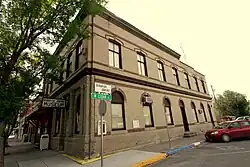 The building is "a well-executed example of the Western Commercial style in two-part commercial block form." The design also included elements of Romanesque Revival style, including use of round arches, pilasters, and a dentilled cornice."[2]