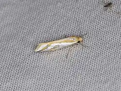 The wingspan is 19–20 mm. The forewings are silvery white with bright orange markings. The costal edge is blackish near the base and there is a moderate streak immediately beneath the costa from the base to the costa before the apex and a rather broad dorsal streak, partly black edged above, from the base to the anal angle, attenuated posteriorly, leaving the inner margin slenderly white near the base only. There are two straight partially black-edged transverse streaks, the first from the subcostal streak at three-fifths to above the middle of the subdorsal but not nearly reaching it, suffusedly barred with blackish grey above the middle, the second from the extremity of the subcostal to the subdorsal before the extremity, suffused with blackish grey towards the costa and on a bar above the lower end. There are also a few blackish scales on the hindmargin. The hindwings are light grey, faintly yellowish tinged.[2]