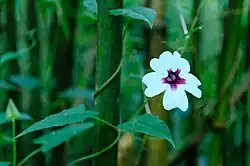 Thunbergia mildbraediana is a herbaceous climbing plant that can reach up to 2 meters in length. It is a perennial species.[1] Its stems are sparsely pilose, with dense hairs forming two distinct bands.[2]