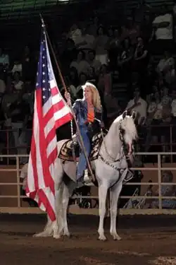 Magness-Blake owned all three of the Arabian horses that portrayed Thunder.[8][33][41] She grew up poor in Philadelphia, and did not ride a horse until she was 20 years old.[6] She married Bob Magness, founder of Tele-Communications Inc., who also loved horses, and together they began an Arabian breeding operation that at its peak had 900 horses.[4] Following the death of her husband in November 1996, Magness-Blake downsized the horse operation and by 2014 owned about 15 horses.[11] In 2004, she married Ernie Blake, an attorney and the mayor of Breckenridge,[42] who also loves horses.[6] The couple, along with two other people, are part of Thunder's ground crew at football games.[4]