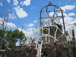 The site covers five acres on the south side of a 1,000-foot (305 m) stretch of Interstate 80. There were originally seven buildings, including a three-story hostel where many hippies stayed in the 1970s.[4] Three stone and concrete buildings remain, and more than 200 concrete sculptures depicting Native Americans and their protective spirits, massacres, and injustices against them. Thunder Mountain Monument (or Park) is replete with found objects, such as car hoods, dolls' heads, typewriters, and gas pumps, many of which are incorporated into the buildings themselves; the third floor has one wall made up of antique bottles which form a stained glass window of a different sort; other floors have windows from antique windshields and bottles incorporated therein to provide a lighting source; one framework forms a large handle so the Great Spirit could take the building away after Thunder's death.[5]