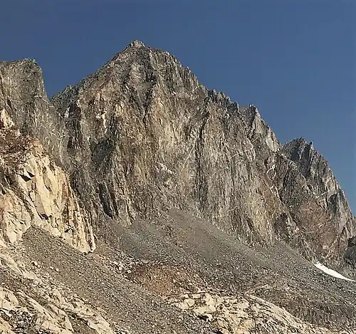 Thunderbolt Peak is a peak in the Palisades group located in the Sierra Nevada of California. It rises to 14,009 feet (4,270 m) and could be considered the thirteenth-highest peak in the state, but since the peak has less than 300 feet (91 m) of prominence it is usually considered a subsidiary peak of North Palisade.[7] But if it is considered a separate mountain peak, Thunderbolt Peak is the northernmost fourteener in the Sierra Nevada.