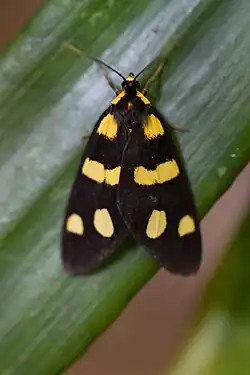 Its frontwings are black-brownish with 5 yellow spots, the wingspan is 26 mm.[2]
