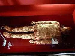 Tianshan town has received its name from its best known natural feature, the Shenju Hill (神居山, literally "home of the spirits"; 32°39′40″N 119°13′29″E / 32.66111°N 119.22472°E), formerly known as "Tianshan" (literally, "heavenly mountain"). Although it is not tall (no more than 50 m above the sea level),[1] it is a basaltic extinct volcano, the only extinct volcano in Yangzhou Prefecture. The tomb of Liu Xu (刘胥), the ruler the Guangling state within the Han Empire, was located at the depth of 25 m inside the extinct volcano. The largely intact tomb was excavated by Chinese archaeologists in 1979–1980. Later, the tomb was re-created, with the original artifacts on display in a purpose-built museum (Han Guangling Royal Tomb Museum, 汉广陵王墓博物馆) in Yangzhou. Although the original funeral jade shroud of Liu Xiu (d. 55 BCE) has been removed to the National Museum of China in Beijing, a full-scale replica is housed here.