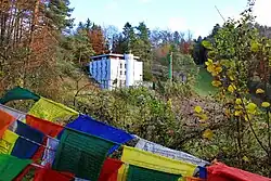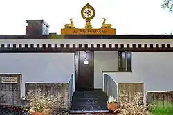 The Tibet-Institut Rikon is the only monastery outside Asia that was founded on behalf of the Dalai Lama. It was inaugurated on 9 November 1968 under the name „Kloster zum Rad der Lehre„ (literally: Monastery for the Wheel of Teaching) - but as a “Monastic Tibet Institute,” as the founding of a monastery was not permitted under the then Swiss federal constitution.[3] The Dalai Lama was also not present at the inauguration: the Federal Council banned him from entering the country.[3] He visited the monastery for the first time in 1973.[4][3] The monastic community in Rikon claims to be the only Tibetan monastery in the West.[5] The monastic Tibet Institute in Rikon was established according to the advice and under the patronage of the 14th Dalai Lama, who emphasized the importance of monasteries for Tibetan people in exile. The Dalai Lama sent an abbot and four monks to Rikon from India. The institute's buildings were designed by architect Ueli Flück (Baden AG), and the foundation stone was laid on 29 July 1967. On 9 November 1968 the monastic Tibet Institute was consecrated by the Dalai Lama's two principal teachers, Trijang Rinpoche and Ling Rinpoche,[6] under the name "Kloster zum Rad der Lehre" (literally: Monastery for the Wheel of Teaching).[4] On 8 April 2010 the 14th Dalai Lama visited the monastery community in Rikon for the 14th time, and was warmly received by Tibetan people, on the occasion of the 50th anniversary of the establishment of Tibetan refugees in Switzerland.[7] The 14th Dalai Lama visited the monastic community again in 2013, 2015 and 2016.[6]