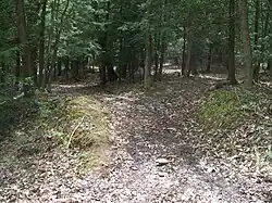 Ticklish Rock is an unusual sandstone rock formation, located in Shrewsbury Township, Sullivan County, Pennsylvania. The brown and green sandstone formation, which stands at the edge of a steep cliff and resembles an upright hammer. It consists of a large horizontal block, 3 feet high, 8 feet long, and 6 feet wide (0.9 x 2.4 x 1.8 m), balanced upon a thin, 18 in × 30 in (46 cm × 76 cm) pedestal.