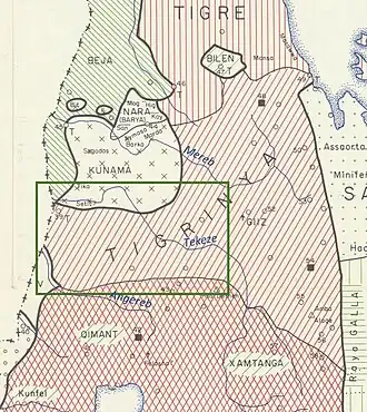 Salt further subdivided the kingdom of Tigré into smaller provinces, referring to the heartland as Tigré proper. This included districts such as Enderta, Agame, Wojjerat, Tembien, Shiré and Baharanegash.[72] Within Baharanegash, the northernmost district of Hamasien marked the edge of Tigré, beyond which Salt noted the presence of the Beja (or Boja) people living further north.[71][73][74]