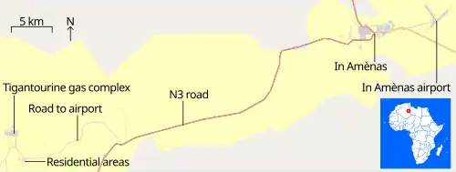 The most detailed publicly available information about the attack comes from the transcript of the eyewitness evidence given to HM Coroner in London.[12] Another source of information is the website for the In Amenas inquest.[13] Tigantourine gas facility is located about 40 kilometres (25 mi) south-west of In Amenas, close to the Libyan border and about 1,300 kilometres (810 mi) south-east of Algeria's capital city, Algiers. The Algerian state oil company Sonatrach operates the gas field jointly with the British firm BP and the Norwegian firm Statoil. It supplies 10% of Algeria's natural gas production.[14]