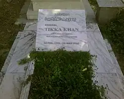 1. ^ a b General Tikka Khan's Headstone (Headstone in graveyard). Army Graveyard, Rawalpindi, Pakistan. 2011.