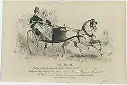 A tilbury is a light, open, two-wheeled carriage, with or without a top, developed in the early 19th century by the London firm of Tilbury, coachbuilders in Mount Street, London[1][2] (see also Stanhope (carriage)). A tilbury rig is little more than a single "tilbury seat"—the firm's characteristic spindle-backed seat with a curved padded backrest— mounted over a raked luggage boot, and fitted with a dashboard and mounting peg, all on an elaborate suspension system of curved leaf springs above the single axle. The tilbury has large wheels for moving fast over rough roads. A tilbury is fast, light, sporty and dangerous:
