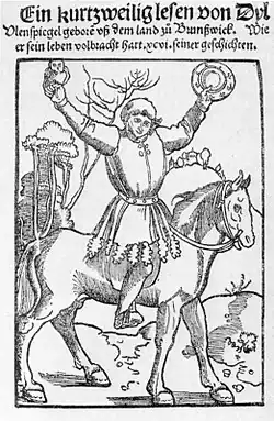 In the chapbooks, Eulenspiegel is presented as a trickster who plays practical jokes on his contemporaries, exposing vices at every turn, greed and folly, hypocrisy and foolishness. As Peter Carels notes, "The fulcrum of his wit in a large number of the tales is his literal interpretation of figurative language."[16] (Previously, Goethe made a similar observation.[17]) Although craftsmen are featured as the principal victims of his pranks, neither the nobility nor the pope is exempt from being affected by him.