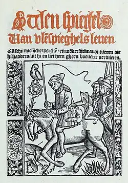 Frontispiece of first Dutch language Ulenspieghel, printed by Michiel Hillen van Hoochstraten, 1525–1546