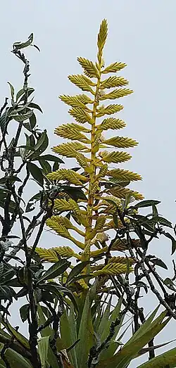 Tillandsia oerstediana is an evergreen plant with grey-green leaves arranged in a rosette up to 40 cm across. When in bloom, it has a golden coloured flowerspike of waxy yellow bracts with tiny, tubular pink flowers.[3]