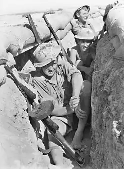 The Strathaird sailed via South Africa to avoid potential attack in the Mediterranean Sea, with a short stop for shore leave in Durban, and disembarked in Egypt just before the new year.[15] Originally, the 18th Brigade was preparing to deploy to Greece as part of the Allied deployment to assist the Greeks against an expected Axis invasion. When Axis forces advanced in Cyrenaica, the brigade was deployed instead to the Libyan port of Tobruk as part of the garrison, the famous "Rats of Tobruk".[16] The town was besieged by the Axis forces from 10 April, and the battalion was heavily engaged until August, including fierce fighting during the Battle of the Salient in May, in which the unit suffered six missing and fifteen wounded.[17] In August, the 2/10th Battalion was withdrawn to Palestine for training, and the following month they were sent to garrison Aleppo in Syria. Syria and Lebanon had been captured from the collaborationist Vichy French by the Allies while the 2/10th Battalion had been at Tobruk.[18] Hughes had a stay in hospital in mid-December.[19]