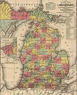 An 1853 map of the U.S. state of Michigan, where timber pirates devastated United States Navy lumber reserves along the Michigan coast.