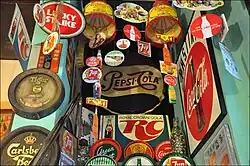 Resembling an old eatery (’kopi tiam’), this setup comes complete with a cashier's counter, stools, tables, mirrors, ashtrays, matchboxes, chopsticks, spittoons, coffee cups and a collection of soft drinks. The drinks here are not for sale.