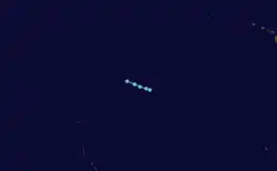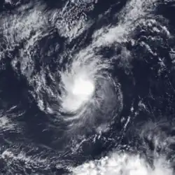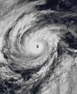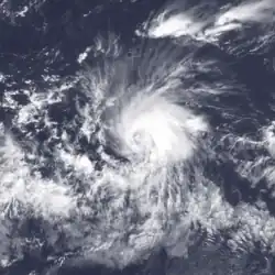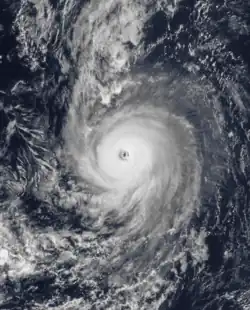 A tropical disturbance developed about 180 mi (290 km) south of the Guatemala coastline. After developing a circulation, the system was upgraded into a tropical depression on July 27. Moving west-northwest, the depression strengthened into Tropical Storm Henriette at 1800 UTC that day.[7] Henriette continued to deepen, and by late on July 28, the storm attained winds of 65 mph (105 km/h).[3] Although initially expected to pose a threat to Hawaii,[17] this did not occur. It rapidly intensified,[3] and late on July 28, the EPHC upgraded the storm into a hurricane. While turning west-southwest on a track similar to Gil's,[7] it attained Category 2 intensity on July 29. At 0000 UTC on July 30, Henriette was upgraded into a Category 3 hurricane. After leveling off in intensity,[3] the storm passed within 70 mi (115 km) within Clipperton Island.[7] Hurricane Henriette attained its peak intensity early on July 31, with winds of 130 mph (215 km/h), a Category 4 system.[3] At peak, Henriette displayed a well-defined eye.[7]