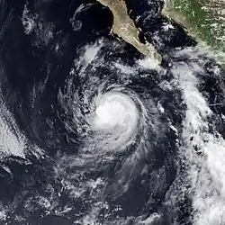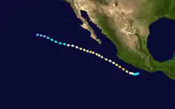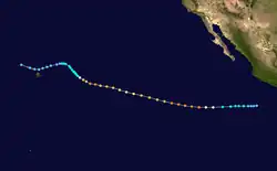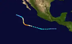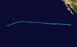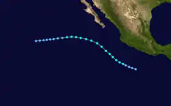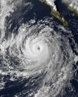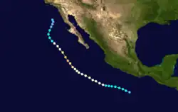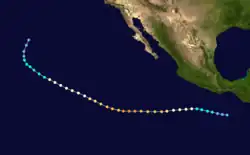 During the 1983 season, a total of 21 named storms formed,[3] which was well-above the long-term average of 15.[4] However, this total was slightly less active than the 1982 Pacific hurricane season, which saw a then-record 22 storms form.[5][6] However, 1983 was at that time the most active season in the Eastern Pacific Hurricane Center (EPHC) warning zone,[7] but this record itself was surpassed during the 1985 Pacific hurricane season,[8] and again in the 1992 Pacific hurricane season.[9] Additionally, 12 storms reached hurricane intensity, which was above the average of eight.[7] Of the 12 hurricanes, eight attained Category 3 intensity or higher on the SSHWS.[4] The season started on May 21 with the formation of Adolph and ended on December 9, with the dissipation of Hurricane Winnie. Lasting 201 days, 1983 was the longest season on record. There were a total of 1,238 storm hours, which was the most in four years.[7] Despite the activity in the EPHC's warning responsibility, only two storms formed in the Central Pacific Hurricane Center (CPHC)'s area of responsibility, both of which stayed depressions.[10] A moderate El Niño was present throughout the season, with water temperatures across the equatorial Central Pacific was nearly 5 °F (0.6 °C) above normal.[11] The Pacific decadal oscillation (PDO) was in a warm phase during this time period.[12] Both of these factors are known to enhance Pacific hurricane season activity. Furthermore, 1983 was in the middle of an era where all but the 1988 Pacific hurricane season was near or above average.[13]