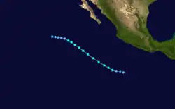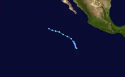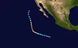 The origins of Hurricane Ismael were from a northward bulge of the Intertropical Convergence Zone (ITCZ) in early August, which resulted in the formation of a tropical depression on August 8. Six hours later, it was upgraded into Tropical storm Ismael. Continuing to intensity, Ismael was upgraded into a hurricane late on August 10 and subsequently developed an eye. The storm soon reached its peak of 100 mph (155 km/h). Late on August 11, Hurricane Ismael began to weaken as it encountered cooler waters and the hurricane was soon downgraded to a Category 1 on the SSHWS. The following day, Ismael was downgraded into a tropical storm about 380 mi (610 km) west of the Baja California peninsula. On August 14, the storm was downgraded into a tropical depression while centered about 250 mi (400 km) west of Point Ensenada.[7] Ismael dissipated that day.[3]