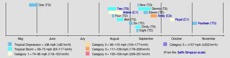 The season had fourteen tropical depressions, of which seven intensified into tropical storms—an average season has ten tropical storms[2]—three became hurricanes and one, Emily, became a major hurricane.[nb 1] The inactivity throughout the basin was linked to persistent, strong vertical wind shear; most of the season's storms were unable to intensify due to the shear, resulting in a low number of named storms and hurricanes.[1] The two most notable storms of the season were Hurricanes Arlene and Emily. Hurricane Arlene spent roughly 14.5 days as a tropical storm before intensifying into a hurricane, the longest span between these intensities on record.[4][nb 2] Hurricane Emily was the only major hurricane of the season; its wind speeds peaked at 125 miles per hour (201 km/h) before impacting the Dominican Republic. Three fatalities occurred in the Dominican Republic because of the storm and damages were estimated up to $80.3 million (1987 USD).[1][5][6][7]