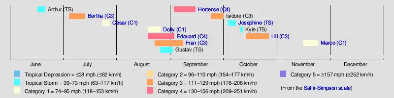 The 1996 Atlantic hurricane season had 13 named storms, of which 9 became hurricanes and 6 became major hurricanes (hurricanes that are classified as Category 3 or higher).[1] These major hurricanes were Bertha, Edouard, Fran, Hortense, Isidore, and Lili.[2][3][4][5][6][7] This timeline documents all the storm formations, strengthening, weakening, landfalls, extratropical transitions, as well as dissipation. The timeline also includes information that was not operationally released, meaning that information from post-storm reviews by the National Hurricane Center, such as information on a storm that was not operationally warned on, has been included. The season officially began on June 1, 1996, and ended on November 30 that same year.