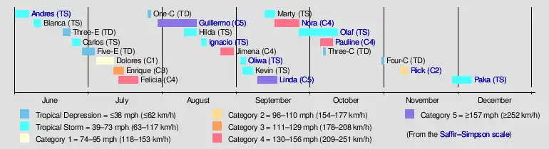 The 1997 Pacific hurricane season was the most active season since the 1994 season, producing 24 tropical depressions, 19 of which became tropical storms or hurricanes. The season officially started on May 15, 1997, in the Eastern Pacific—designated as the area east of 140°W—and on June 1, 1997, in the Central Pacific, which is between the International Date Line and 140°W. The season officially ended in both basins on November 30, 1997. These dates typically limit the period of each year when most tropical cyclones form in the eastern Pacific basin. This timeline documents all the storm formations, strengthening, weakening, landfalls, extratropical transitions, as well as dissipation. The timeline also includes information which was not operationally released, meaning that information from post-storm reviews by the National Hurricane Center, such as information on a storm that was not operationally warned on, has been included.