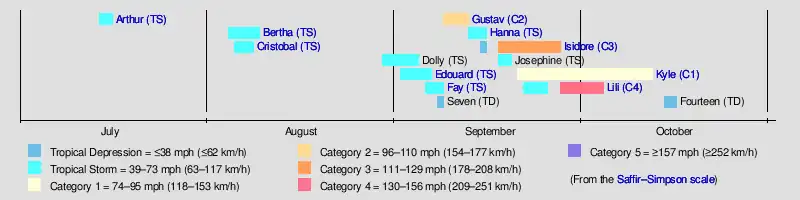 The 2002 Atlantic hurricane season was an average Atlantic hurricane season in which twelve named storms formed.[nb 1] Although Tropical Storm Arthur formed on July 14, the season officially began on June 1 and ended on November 30, dates that conventionally delimit the period of each year when most tropical cyclones develop in the Atlantic basin.[2] The season's final storm, Tropical Depression Fourteen, dissipated on October 16.