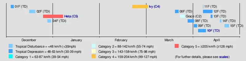 During the season at least 16 deaths resulted from tropical disturbances whilst overall damage was estimated at $218 million (2004 USD; $363 million 2025 USD). The most damaging tropical disturbance was Cyclone Heta which caused at least $211 million (2004 USD; $351 million 2025 USD) in damage to six different countries and left three dead.[2][3][4] The deadliest tropical disturbance of the season was Tropical Depression 10F, which was responsible for eleven deaths and caused $2.74 million (2004 USD; $4.56 million 2025 USD) in damage.[5] Cyclone Ivy also caused 2 deaths and caused $4.17 million (2004 USD; $6.95 million 2025 USD) worth of damage to Vanuatu.[2][6] As a result of the impacts caused by Heta and Ivy, the names were retired from the tropical cyclone naming lists.[1]