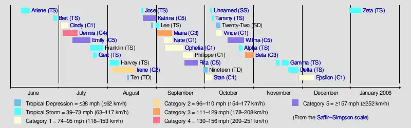 The 2005 Atlantic hurricane season was an event in the annual tropical cyclone season in the north Atlantic Ocean. It was the second most active Atlantic hurricane season in recorded history, and the most extreme (i.e. produced the highest accumulated cyclone energy (ACE)) in the satellite era.[1] Officially, the season began on June 1, 2005 and ended on November 30, 2005. These dates, adopted by convention, historically delimit the period in each year when most tropical systems form.[2] The season's first storm, Tropical Storm Arlene, developed on June 8. The final storm, Tropical Storm Zeta, formed in late December and persisted until January 6, 2006. Zeta is only the second December Atlantic storm in recorded history to survive into January, joining Hurricane Alice in 1955.[3]