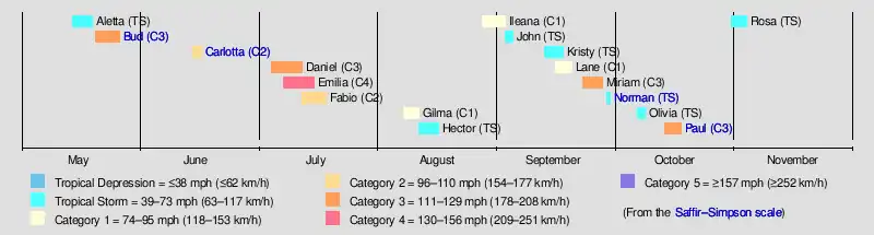 The season produced seventeen tropical storms; ten became hurricanes, and five further intensified into major hurricanes.[nb 2] Impact during the season was relatively minimal. In late May, Hurricane Bud paralleled the western Mexico coastline before dissipating, causing minor damage and but no reported fatalities.[4] In mid-June, Hurricane Carlotta came ashore in Oaxaca at Category 2 hurricane intensity, making it the easternmost tropical cyclone in the basin to make landfall at hurricane intensity since 1966. The storm killed seven and caused $12.4 million (2012 USD) in damage.[5]