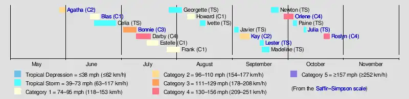 The 2022 Pacific hurricane season was a fairly active tropical cyclone season, with 19 named storm altogether. Ten of those became hurricanes, and four further intensified into major hurricanes (category 3 or higher on the 5-level Saffir–Simpson wind speed scale). Two of this season's storms, Bonnie and Julia, survived the overland crossover from the Atlantic.[1] The season officially started on May 15 in the eastern Pacific—east of 140°W—and June 1 in the central Pacific—between the International Date Line and 140°W, and ended in both regions on November 30. These dates conventionally delimit the period of each year when most tropical cyclones form in the eastern Pacific basin.[2] The season's first storm, Agatha, formed on May 28, and last, Roslyn, dissipated on October 23. Rosyln made landfall in Nayarit with 120 mph (195 km/h) winds, making it the strongest landfalling Pacific hurricane since Patricia in 2015.[3] The season's first major hurricane, Bonnie, entered into the basin from the Atlantic basin on July 2, after crossing Nicaragua as a tropical storm, becoming the first storm to survive the crossover from the Atlantic to the Pacific since Otto in 2016.[4] Three months later, Julia became the second to do so.[5]