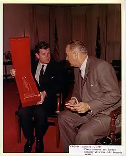 Senator Ted Kennedy presents Joseph P. Kennedy Award to President Johnson, 7 January 1964