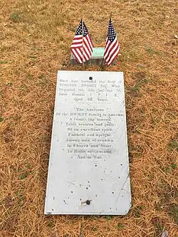 Dwight built the first tomb in the Old Village Cemetery around 1700.[13][9] In that tomb are laid his body, Eleazer Lusher, William Adams,[2] and his wife, Bethia Dwight.[8] He died on January 31, 1717 (January 31, 1718 N.S.), and was buried on February 7, 1717 (February 7, 1918 N.S.), the same day as his wife, Bethia, who died the day before.[1][2][7][8] His pallbearers included Governor Joseph Dudley and Judge Samuel Sewall.[2][14]